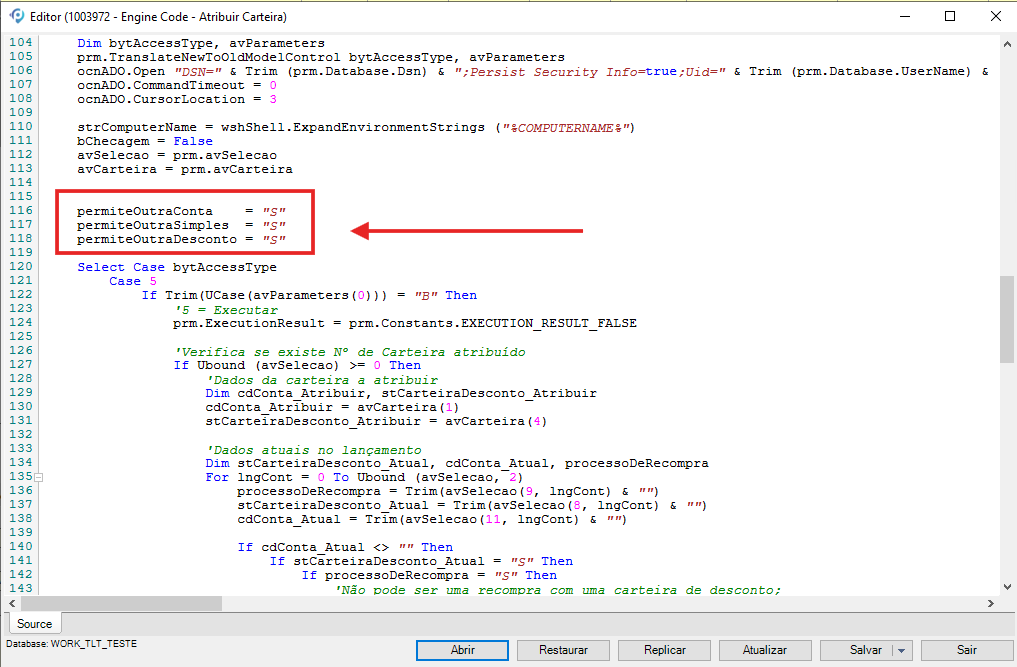 Ex 1: Atribuição entre carteiras simples de mesma conta –> Necessário que a flag permiteOutraSimples seja marcada como “S”. Dessa forma: