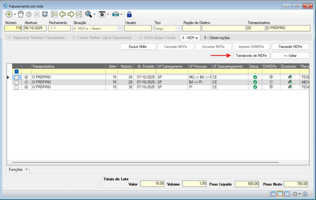 Após o encerramento, o botão Transbordo de MDF-e será habilitado.