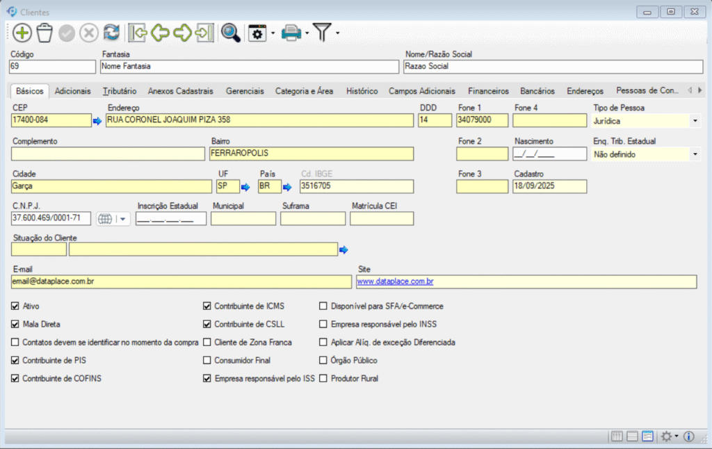 A aba Básico concentra os dados essenciais de identificação do cliente, como endereço, telefones, documentos fiscais e opções que afetam o faturamento. Por isso, ela é considerada a fundamental para a criação do cadastro.