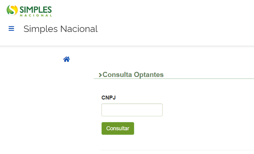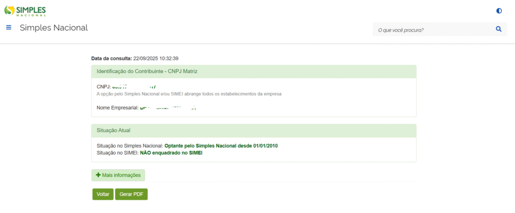 Caso não haja inconsistências no CNPJ ou nos caracteres digitados, será exibida a página com as informações do regime tributário do cliente.