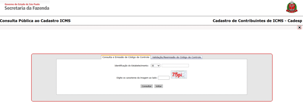 Ao clicar na ferramenta, o sistema abre automaticamente o site correspondente ao estado do cliente. Para avançar, basta preencher os campos solicitados (CNPJ ou Inscrição Estadual, além dos caracteres de validação) e confirmar a consulta.
