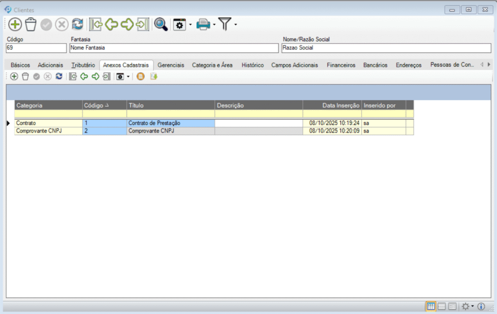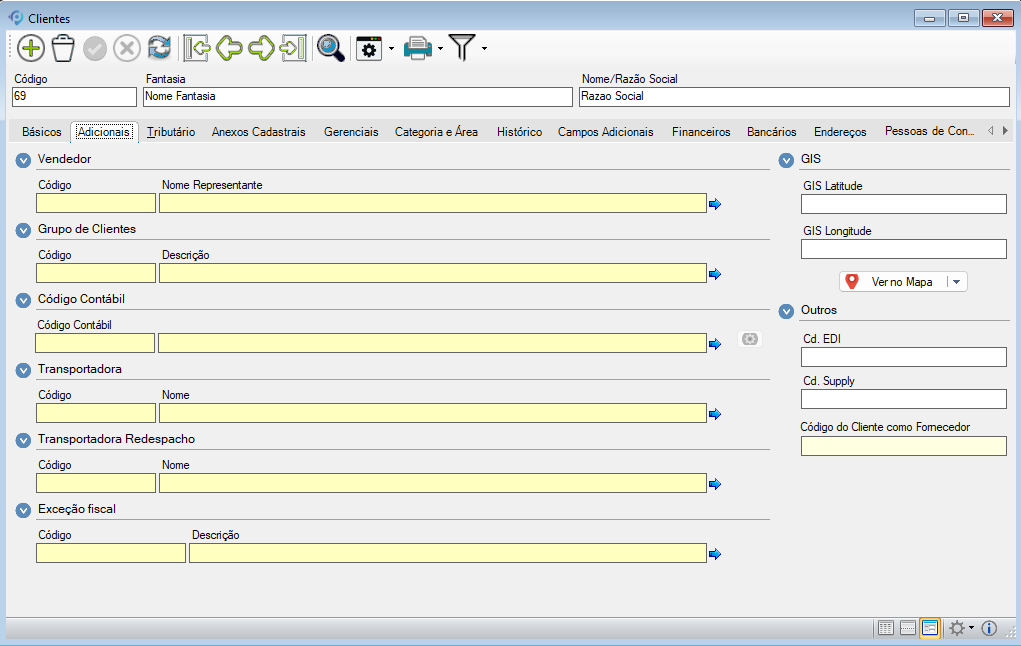 O cadastro é organizado em abas, facilitando a navegação e a consulta de informações específicas. Cada aba concentra um conjunto de campos relacionados, que podem ser preenchidos conforme a necessidade da empresa.