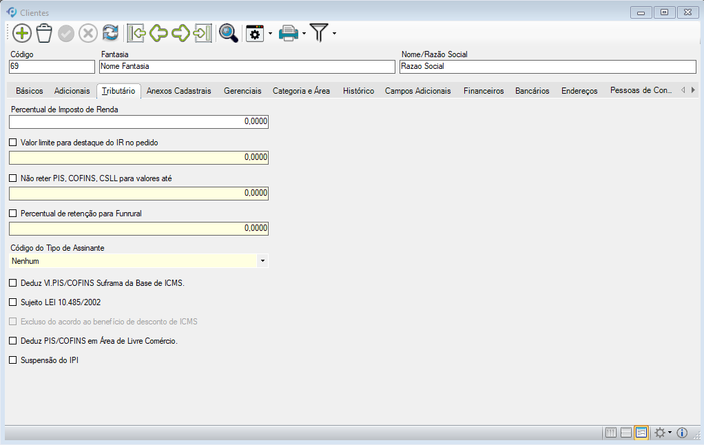 - Contribuinte de PIS, COFINS e CSLL: define se o cliente é contribuinte desses tributos, refletindo nos cálculos do faturamento.