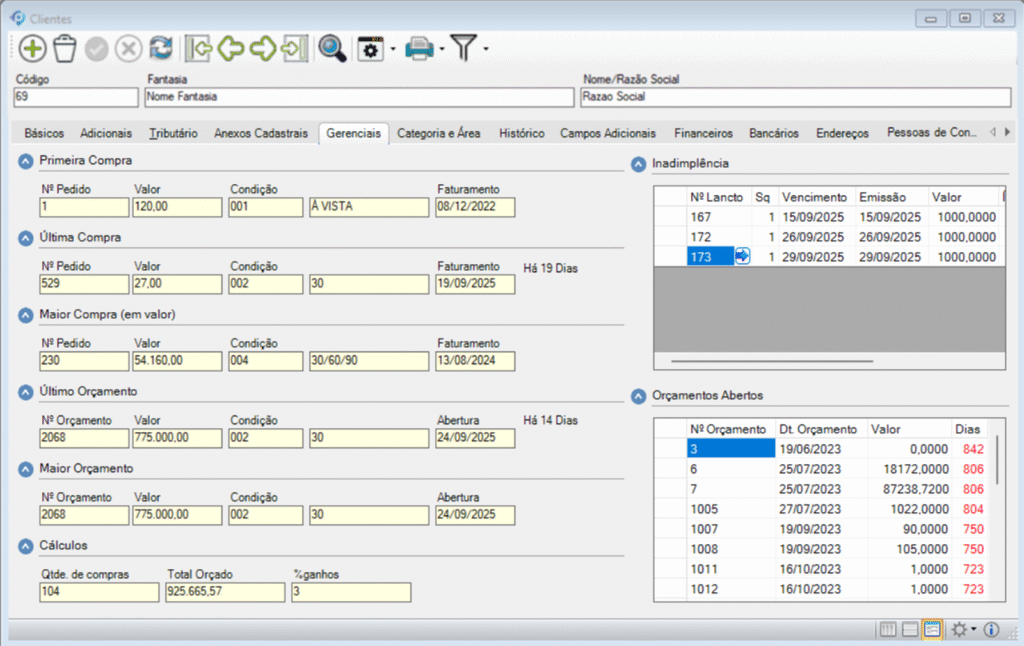 - Inadimplência: Nesta tabela, é possível visualizar os pedidos de faturamento não quitados e o tempo de atraso na quitação, incluindo: