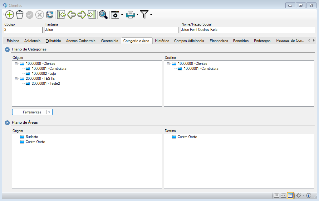 A aba Categoria e Área permite elaborar o plano de categorias e definir o plano de áreas de um cliente.