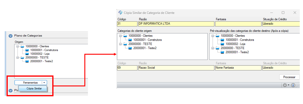 - Clique em Processar para executar a cópia das categorias do cliente origem para o cliente destino.