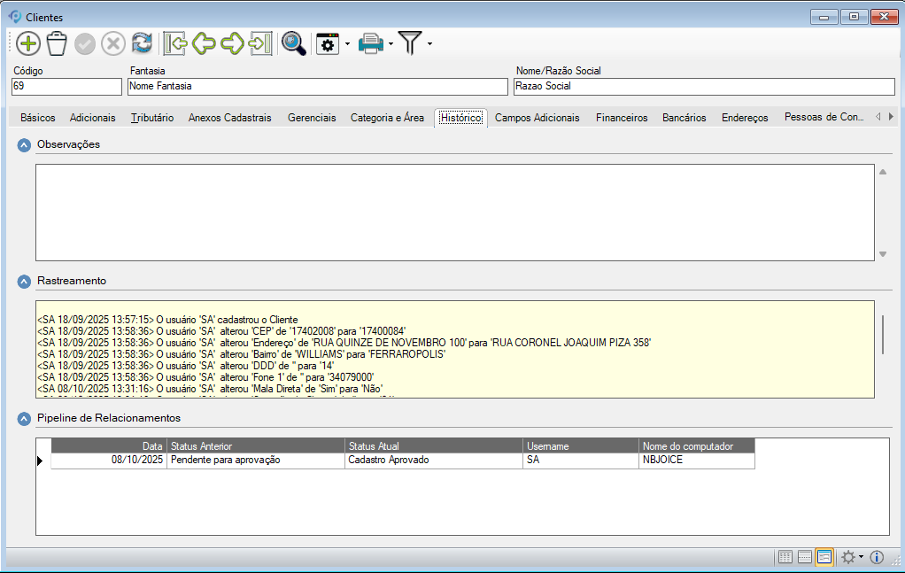 - Pipeline de Relacionamentos: Exibe alterações no status do cliente, mostrando a Data/Hora da alteração, o Status Anterior e o Status Atual. Essa visualização permite acompanhar a evolução do relacionamento do cliente e entender seu histórico de situação dentro do sistema.