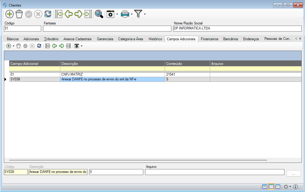 - Código / Descrição: Informe o código de identificação do campo adicional para associá-lo ao cliente. Os códigos e descrições são definidos previamente na manutenção de Campos Adicionais.