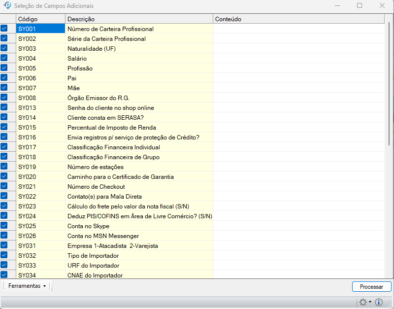 Na tela exibida, marque os campos adicionais desejados, preencha o campo Conteúdo correspondente e clique em Processar para concluir a inclusão.