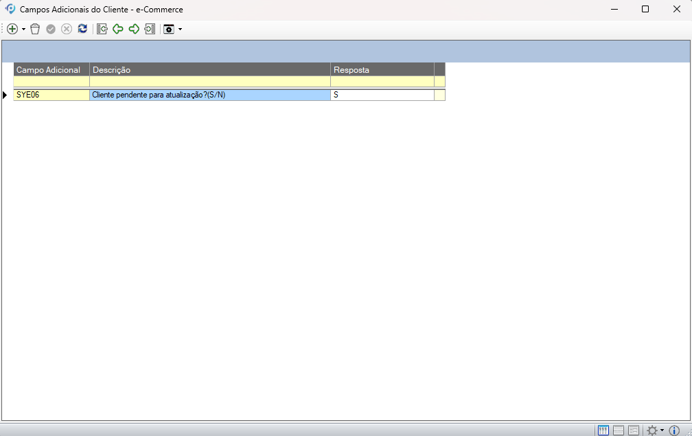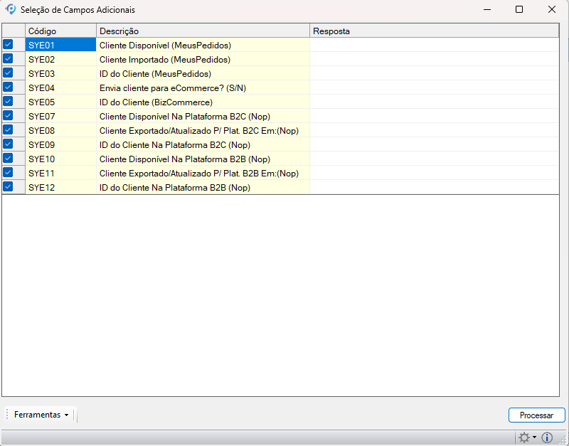Os campos reservados pelo sistema seguem o prefixo “SYE” (por exemplo, SYE002), garantindo a padronização das informações trocadas entre o ERP e o ambiente de vendas online.
