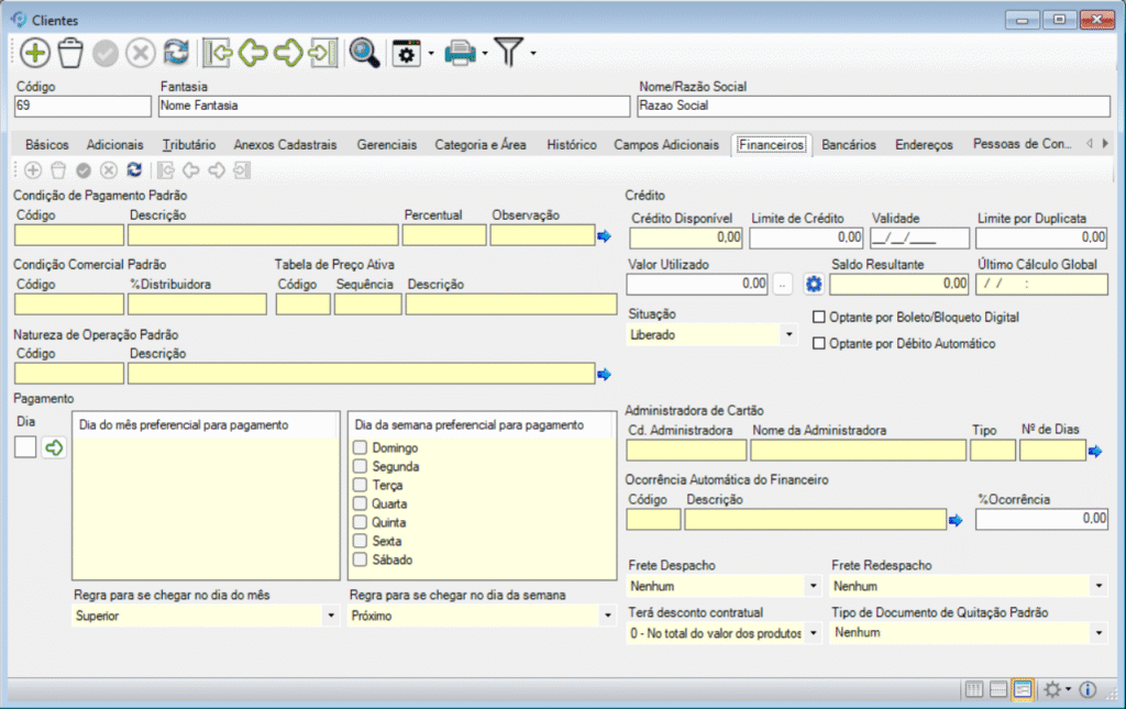 - Pagamento: Nesta área é possível definir os dias preferenciais de vencimento dos débitos do cliente, permitindo que o sistema gere parcelas conforme essas preferências.