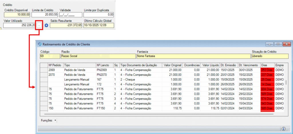 - Rastreamento de Crédito do Cliente: Permite identificar e rastrear o crédito utilizado pelo cliente, exibindo informações como Nº Pedido, Nº Lançamento, Tipo de Documento, Valor, Data de Emissão, Data de Vencimento e Dias (para vencimento ou atraso). O campo Nº Pedido possui o recurso da Seta Azul, permitindo acesso rápido à manutenção do pedido. Somente serão exibidos registros dentro dos critérios configurados. Caso o usuário não possua acesso ao banco de dados vinculado ao registro, será exibida uma notificação nas informações adicionais da manutenção.