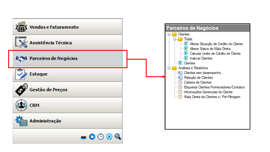 A Gestão de Clientes reúne as funcionalidades necessárias para administrar os cadastros e o relacionamento com os clientes da sua empresa. Atualmente, esses recursos estão organizados dentro do menu Parceiros de Negócios, no módulo de Vendas e Financeiro.