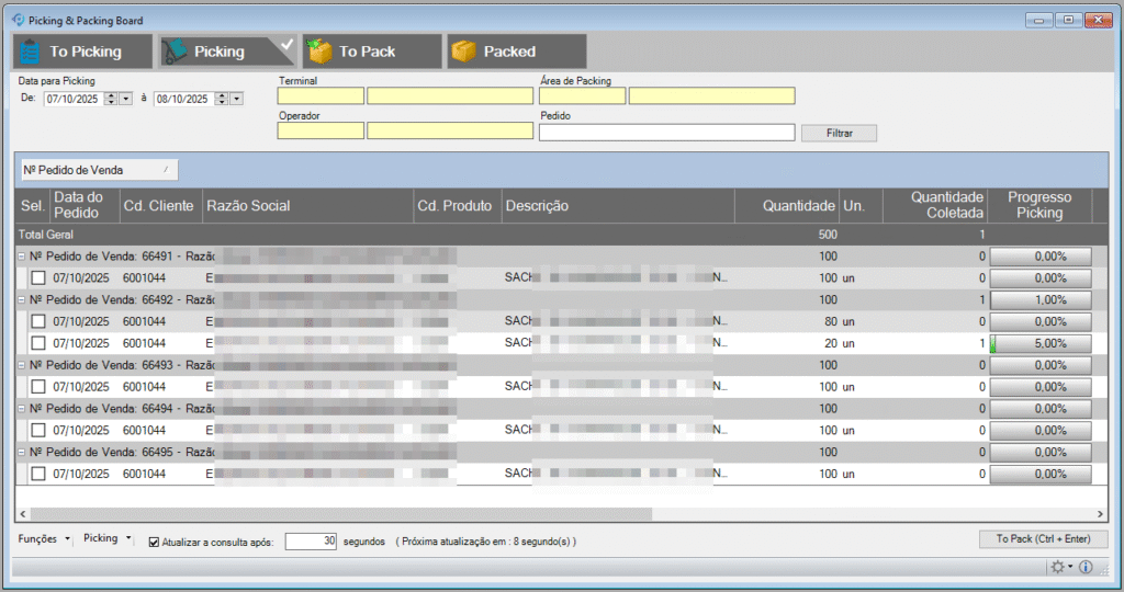 No menu Picking existem alguns recursos que podem ser utilizados para auxiliar no processo da etapa de Picking, antes da utilização da ferramenta selecione um item de um pedido de venda listado na tabela acima.