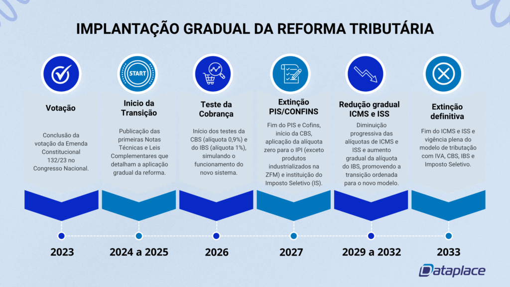 O período de transição está previsto para se estender até 2033, quando tributos como ICMS e ISS serão definitivamente substituídos pelo novo Imposto sobre Bens e Serviços (IBS). Essa abordagem gradual busca oferecer mais previsibilidade, permitindo ajustes e adaptação de processos contábeis, fiscais e administrativos ao longo do tempo.