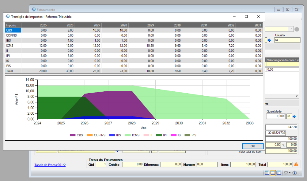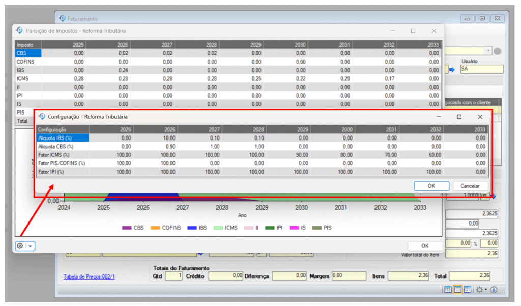 Ao acionar esse botão, o sistema apresenta uma simulação da carga tributária considerando as alíquotas de transição já divulgadas pelos órgãos competentes.