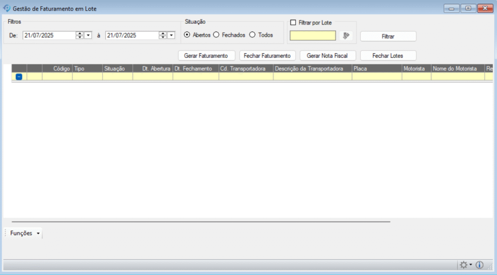 • Fechar Lote: Finaliza o processo de faturamento e encerra o lote.