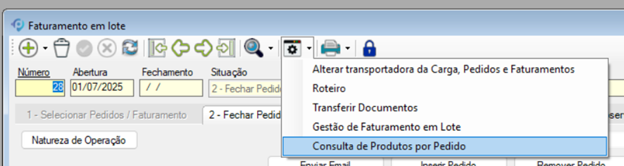 • Fechar Faturamento: Finaliza os pedidos de faturamento gerados.